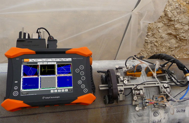 PAUT is an advanced non-destructive examination technique that utilizes a set of ultrasonic testing (UT) probes made up of numerous small elements, each of which is pulsed individually with computer-calculated timing (“phasing”). When these elements are excited using different time delays, the beams can be steered at different angles, focused at different depths, or multiplexed over the length of a long array, creating the electronic movement of the beam. PAUT can be used to inspect almost any material where traditional UT methods have been utilized and are often used for weld inspections and crack detection.